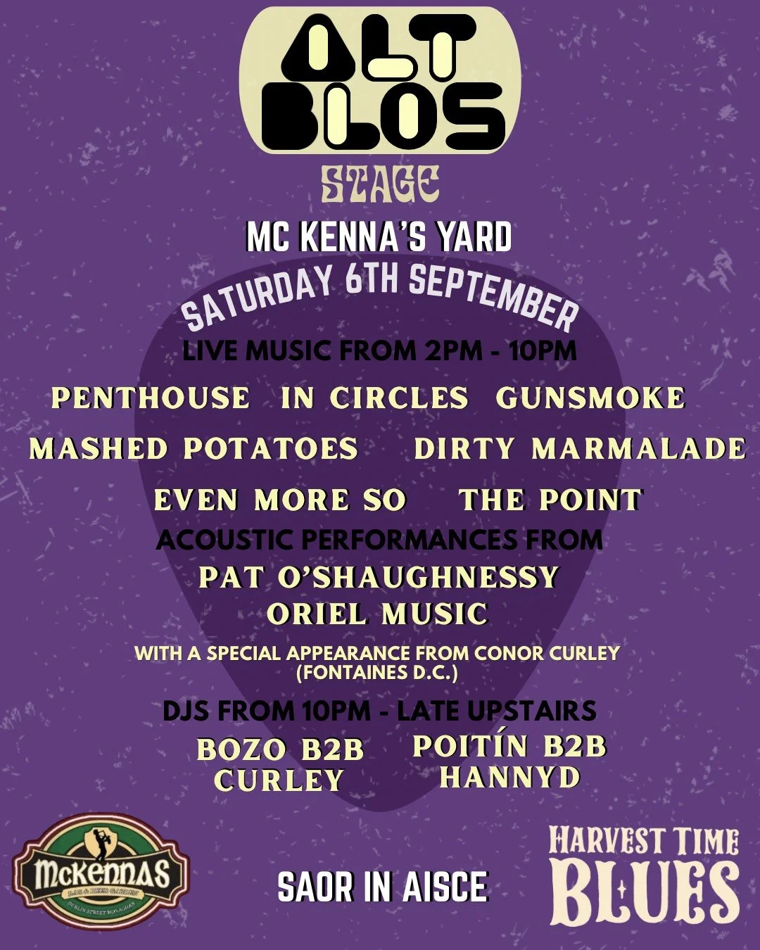 The Alternative Blues Stage was founded back in 2009 by a group of young local musicians under the name of “Sketch!” eager to showcase their talent at the Harvest time blues - a festival with international acclaim. After the inaugural year and successful reviews, the founding organiser and singer of the band “Sketch!”, Ben Lamb O Sullivan, saw the opportunity to give back to the artists of Monaghan. Ben became the sole organiser and manager of the stage for nearly ten years, personally funding it and advocating against drawbacks from County councils, TDs and Gardaí for the stage to become an official part of the festival, which it is now today.
